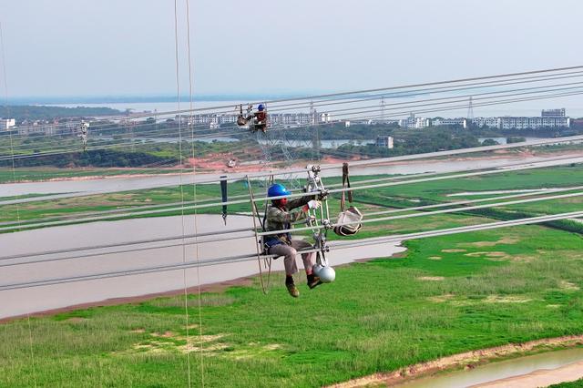 國網(wǎng)江西電力建設(shè)公司施工人員在武漢—南昌1000千伏雙回線路工程安裝間隔棒。