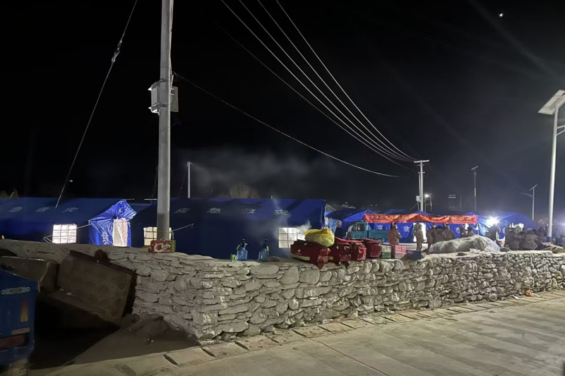 ▲國(guó)網(wǎng)西藏電力員工連夜奮戰(zhàn),點(diǎn)亮定日縣安置點(diǎn)帳篷