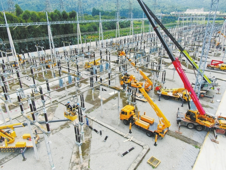 工作人員對(duì)220千伏草鋪?zhàn)冸娬倦[患母線進(jìn)行更換。 盧顯侖 攝