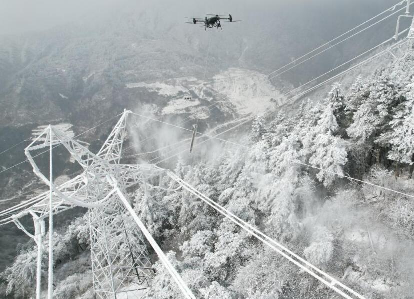 在海拔2800米的雅安市漢源縣蓑衣嶺,氣溫降至零下7℃,連接雅安至樂山的220千伏漢音輸電線路覆冰厚度已達10毫米。國網(wǎng)雅安供電公司組織電力運維人員持續(xù)開展冰情監(jiān)測,運用無人機搭載除冰裝置撞擊覆冰導線完成帶電除冰,及時消除輸電線路安全隱患。