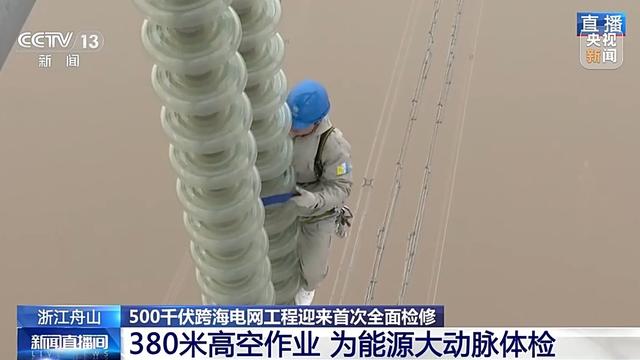 總臺(tái)記者 于晨:我現(xiàn)在所在的位置就是全線四個(gè)架空大跨越線路中規(guī)模最大的一條,位于舟山金塘島一側(cè)的西堠門大跨越的輸電高塔上,整個(gè)塔高380米,一百二三十層樓高,我們從塔底爬到塔頂就花費(fèi)了1個(gè)多小時(shí)。它是目前世界跨海最高的輸電鐵塔,從金塘島到對(duì)岸的冊(cè)子島,共有兩座這樣380米高的輸電鐵塔。