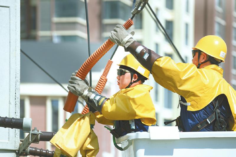 國(guó)網(wǎng)綿陽(yáng)供電公司電力工人正進(jìn)行帶電作業(yè),保障夏季電力供應(yīng)。田海 攝