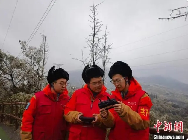 晉電援湘抗冰突擊隊隊員利用無人機(jī)觀察冰情。國網(wǎng)山西省電力公司供圖