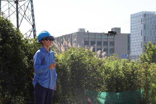 圖為工作人員應用飛行眼鏡操控無人機,對配電線路開展沉浸式巡線。新華社發(fā)(邵哲文 攝)