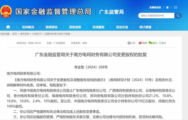 近日,廣東金融監(jiān)管局公布相關批復,同意中國南方電網有限責任公司(簡稱:南方電網)受讓廣東電網有限責任公司、廣西電網有限責任公司、云南電網有限責任公司、貴州電網有限責任公司、海南電網有限責任公司、深圳供電局有限公司分別持有的南方電網財務有限公司(簡稱:南方電網財務公司)21.2%、10.8%、10.8%、10.8%、2.4%、10%股權。受讓后,南方電網合計持有南方電網財務公司70億元股份,持股比例為100%股權。以下是相關批復正文:
