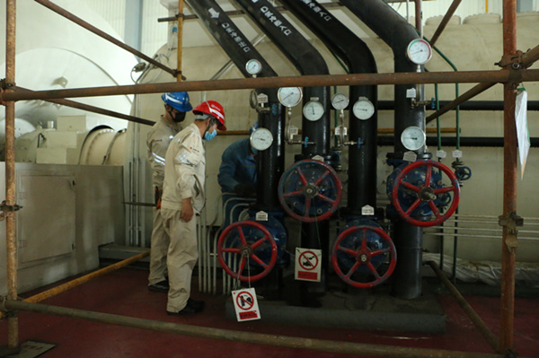攻堅(jiān)克難,保機(jī)組穩(wěn)定運(yùn)行。大鵬之動(dòng),非一羽之輕也;騏驥之速,非一足之力也。盛夏的廠房內(nèi)異常悶熱,機(jī)組設(shè)備發(fā)出來的熱量讓人喘不過氣來,就在這種條件下,該廠干部職工為了快速消除缺陷,不懼困難,連續(xù)奮戰(zhàn)在現(xiàn)場??偣こ處煻诖蠹易⒁獍踩?,輪換休息,防止中暑,并協(xié)調(diào)解決工器具及材料,查看作業(yè)環(huán)境,檢查安全措施;設(shè)備部積極與哈爾濱電機(jī)廠取得聯(lián)系,請專業(yè)人員入廠探討解決方法,同時(shí)編制安全技術(shù)組織措施方案,解決設(shè)備作業(yè)過程中遇到的技術(shù)性問題,對(duì)設(shè)備作業(yè)過程中出現(xiàn)的質(zhì)量問題提出整改意見;安監(jiān)部強(qiáng)化監(jiān)督,從兩票控制措施執(zhí)行、腳手架及現(xiàn)場防爆行燈漏電保護(hù)器的使用情況到確認(rèn)施工現(xiàn)場氫氣含量等無死角的全程檢查盯守,為消缺工作保駕護(hù)航;發(fā)電部運(yùn)行人員全力配合,嚴(yán)格按照工作票所列危險(xiǎn)點(diǎn)布置安全措施,開關(guān)閥門,在檢修期間密切監(jiān)視發(fā)電機(jī)風(fēng)溫,發(fā)現(xiàn)問題及時(shí)對(duì)參數(shù)進(jìn)行調(diào)整,在保證機(jī)組安全運(yùn)行的基礎(chǔ)上,為消缺工作創(chuàng)造便利條件;電氣車間電機(jī)班人員分解氫冷器冷卻水出、入口法蘭短接及彎頭,在氫冷器冷卻水入口法蘭處加裝堵板,把配制好的藥液從氫冷器冷卻水出口彎頭處注滿氫冷器。工作中大家分工明確,忙而不亂,盡管現(xiàn)場氣溫高,卻沒有阻擋大家的干勁。