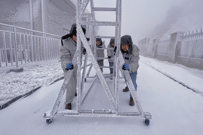 在冰凍中連續(xù)作業(yè)二、三個(gè)小時(shí),冰雪落在他們的帽子上、衣服上、鞋上,凝結(jié)成僵硬的冰塊;吹在頭發(fā)上、胡渣上,化作冰花將他們變成“守護(hù)平安”的圣誕老人模樣。