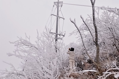 9m/s的疾風(fēng)夾著凍雨、飄雪,像刀子一般刮得臉頰生疼,雪地里呆上十分鐘,便手腳凍得通紅腫脹活動(dòng)受限。在做好充分準(zhǔn)備的條件下,A、B、C三相融冰短接線接線最快也得一個(gè)小時(shí),非常挑戰(zhàn)人員的抗凍極限。大家都聚集在雪地中各司其中,搬熱水、扶梯子、驗(yàn)電、掛接地線、接融冰短接線......鮮艷的黨旗迎風(fēng)飄揚(yáng),仿佛在為他們吶喊加油鼓勁。