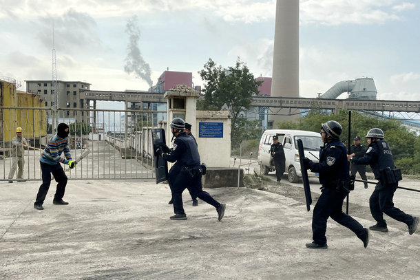 按照演習(xí)方案,兩名“假想嫌疑人”持器械翻越生產(chǎn)區(qū)域3號門,企圖闖入油泵房破壞生產(chǎn)設(shè)施。生產(chǎn)值班人員發(fā)現(xiàn)歹徒欲行闖入,立即上報,同時進行攔截。該公司應(yīng)急辦迅速啟動應(yīng)急預(yù)案,并向公安機關(guān)報警,要求出警支援。接到報警后,鎮(zhèn)派出所快速組織警力趕到事發(fā)現(xiàn)場,幾經(jīng)周旋,與公司內(nèi)保人員一起將“恐怖分子”控制抓捕。演練過程中,該公司各個部門反映迅速,配合默契,采取處置措施及時、合理、表現(xiàn)出良好的處理突發(fā)事件的能力。