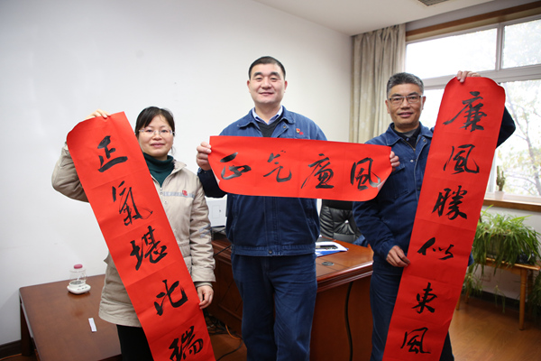 寧柏偉給該公司總經(jīng)部、財務部、燃運部、思政部、前期辦以及法律(風控)事務部等部門贈送了廉潔春聯(lián)。每到一處,寧柏偉親自將春聯(lián)送到各部門負責人手中,并合影留念表達新年祝福。他談到,此次送廉政春聯(lián)活動,該公司紀委首次將范圍擴大到全體部門,通過開展為部門送廉政春聯(lián)活動,寓教于樂,宣傳廉政紀律,提醒領導干部員工時刻繃緊廉潔自律線,清廉、祥和過春節(jié);同時將廉政文化元素融入春聯(lián)之中,展示了中國傳統(tǒng)文化,以喜慶的形式弘揚清風正氣,傳遞廉潔正能量。