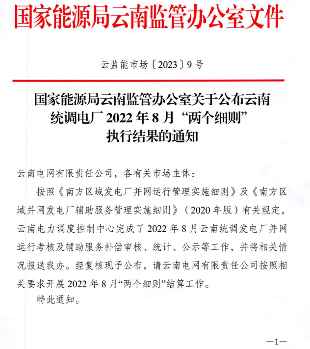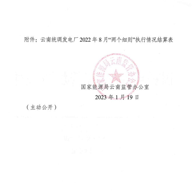 1月19日,國家能源局云南監(jiān)管辦公室公布云南統(tǒng)調電廠2022年8月“兩個細則”執(zhí)行結果。