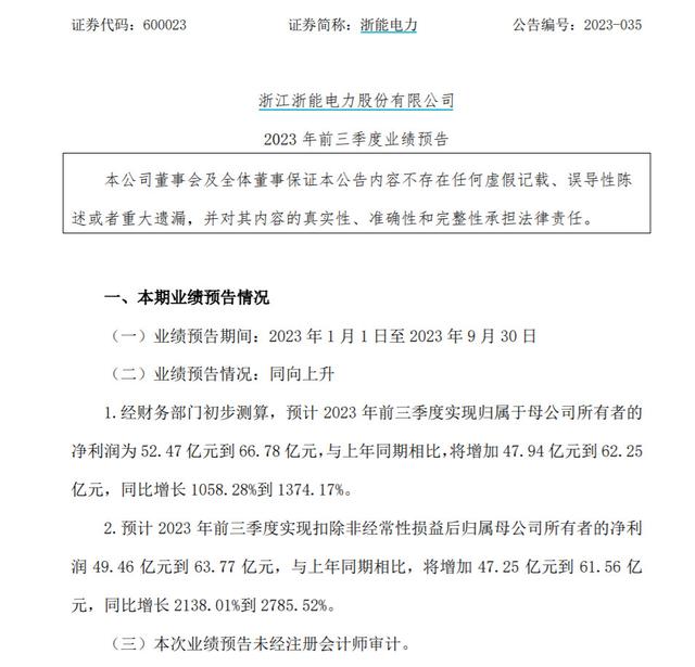 浙能電力稱(chēng),經(jīng)財(cái)務(wù)部門(mén)初步測(cè)算,預(yù)計(jì)2023年前三季度實(shí)現(xiàn)歸屬于母公司所有者的凈利潤(rùn)為52.47億元到66.78億元,與上年同期相比,將增加47.94億元到62.25億元,同比增長(zhǎng)1058.28%到1374.17%。預(yù)計(jì)2023年前三季度實(shí)現(xiàn)扣除非經(jīng)常性損益后歸屬母公司所有者的凈利潤(rùn)49.46億元到63.77億元,與上年同期相比,將增加47.25億元到61.56億元,同比增長(zhǎng)2138.01%到2785.52%。