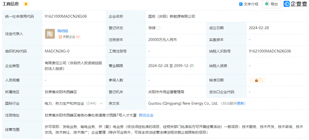 2月28日,國(guó)投(慶陽(yáng))新能源有限公司成立,法定代表人為陶相棟,注冊(cè)資本為20000萬(wàn)元人民幣。