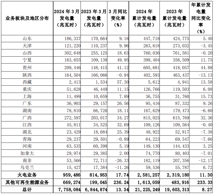 截至2024年3月31日,本公司2024年累計完成發(fā)電量21,225,249兆瓦時,較2023年同期同比增長8.27%。其中,風電發(fā)電量增長1.37%,火電發(fā)電量增長11.30%,其他可再生能源發(fā)電量增長233.33%。2024年3月發(fā)電量詳情如下: