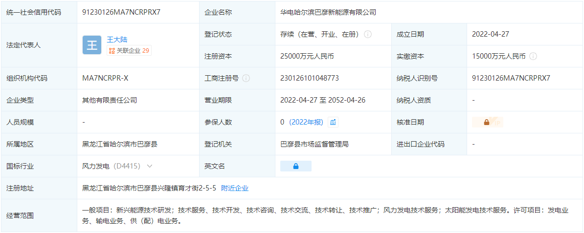 企查查顯示,4月28日,華電(哈爾濱)新能源有限公司成立,法定代表人為鄭勇斗,注冊資本1000萬人民幣,經(jīng)營范圍含新興能源技術(shù)研發(fā)、風力發(fā)電技術(shù)服務、太陽能發(fā)電技術(shù)服務、儲能技術(shù)服務等。該公司由華電能源(600726)全資持股。