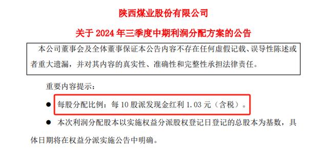 值得注意的是,就在收購公告同天,陜西煤業(yè)還發(fā)布了2024年三季度中期利潤分配方案。