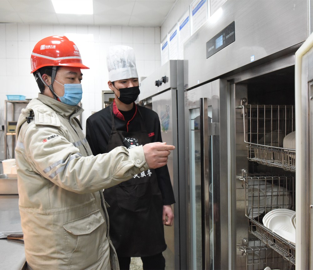 張惠明檢查食堂碗筷消毒情況