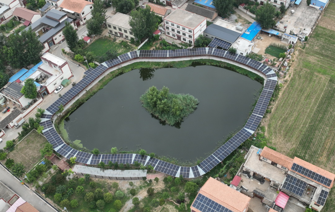 ▲河南省蘭考縣付樓村利用坑塘周圍區(qū)域搭建光伏長廊