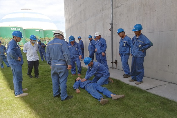 該公司根據(jù)《國家能源集團(tuán)福建能源有限責(zé)任公司外包項(xiàng)目安全管理規(guī)定》要求,檢驗(yàn)與長期承包單位間的聯(lián)合應(yīng)急指揮、應(yīng)急處置及應(yīng)急救援能力,為防止員工進(jìn)入狹小受限空間作業(yè)對(duì)施工人員帶來的氣體中毒等傷害,編制現(xiàn)場處置方案。演練中一名施工人員在生活污水井防腐作業(yè)時(shí),突然發(fā)生氣體中毒導(dǎo)致昏迷,在旁施工人員發(fā)現(xiàn)后立即采取應(yīng)急救援措施,正確佩戴防護(hù)裝備,將中暑人員用安全繩順利拉出并抬至陰涼通風(fēng)區(qū)域,解開中暑人員上衣散熱并觀察呼吸狀況,用心肺復(fù)蘇法進(jìn)行胸外按壓進(jìn)行急救。