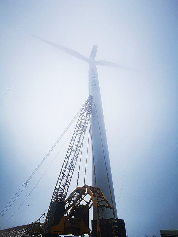 該項目自2021年8月2日全面開工建設(shè)以來,全員克服時間緊、任務(wù)重,以及夏季長時間高溫、近期溫度驟降、山上風(fēng)力較大等重重困難,縝密部署,團(tuán)結(jié)拼搏,以扎實的管理、良好的協(xié)調(diào)、有力的措施,特別是針對作業(yè)高峰期充分討論、采取舉措,在大件運(yùn)輸、吊裝等工作中做到了有方案、有計劃、有落實。經(jīng)過節(jié)假無休、連續(xù)作戰(zhàn),先后完成了十臺風(fēng)機(jī)基礎(chǔ)澆筑工作,并于10月13日正式完成首臺風(fēng)機(jī)吊裝工作,呈現(xiàn)出“驕陽壁嶺轟聲震,崇山風(fēng)嘯鐵臂搖”的一派火熱建設(shè)局面。