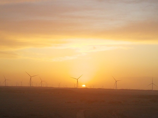 茫茫的戈壁灘,視野盡頭,是一條天地交接的分割線,成百上千的“大風車”(風力發(fā)電機組),一排排旋轉的風機擎天而立、迎風飛旋,與藍天、白云相襯,蔚為壯觀,巨大的葉片在風中緩緩轉動劃出優(yōu)美的弧線,我贊嘆不已,拿起手機,拍下了這獨有的“風景”。