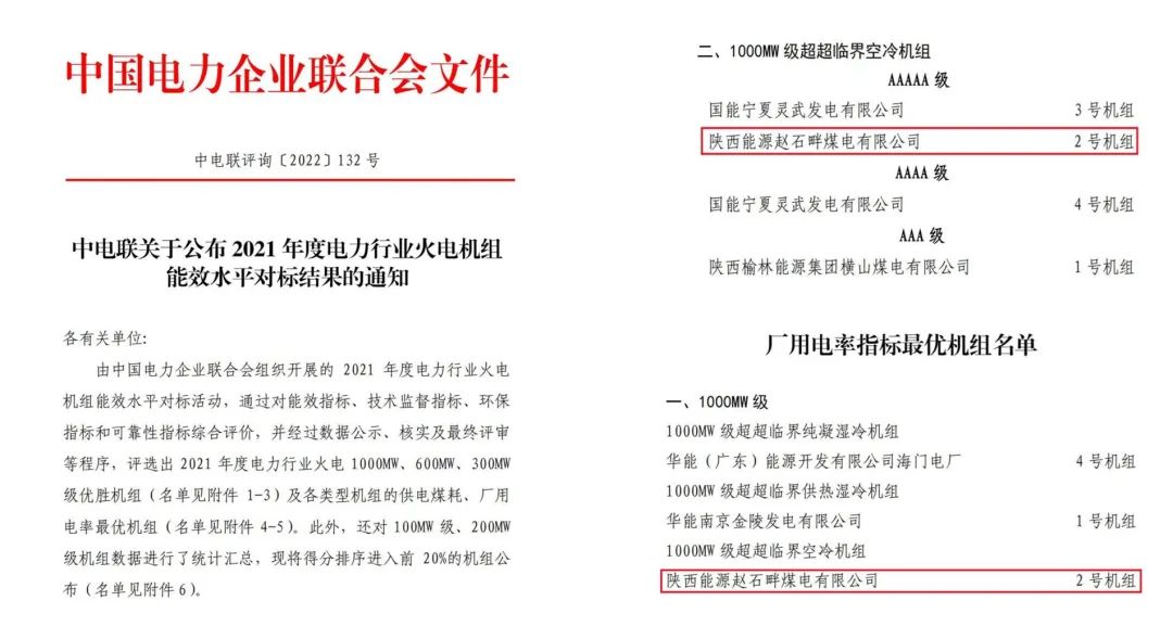 中國電力網(wǎng)訊  6月29日,從中電聯(lián)傳來喜訊,趙石畔煤電公司2號機(jī)組榮獲2021年度電力行業(yè)1000MW級超超臨界空冷機(jī)組指標(biāo)對標(biāo)“AAAAA級優(yōu)勝機(jī)組”及“廠用電率指標(biāo)最優(yōu)機(jī)組”。