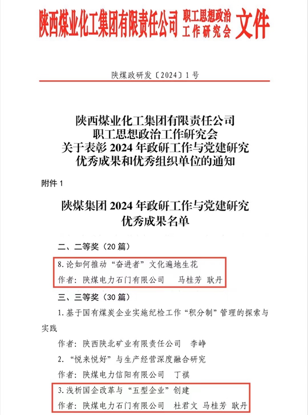 陜煤石電2項(xiàng)政研成果獲集團(tuán)公司表彰
