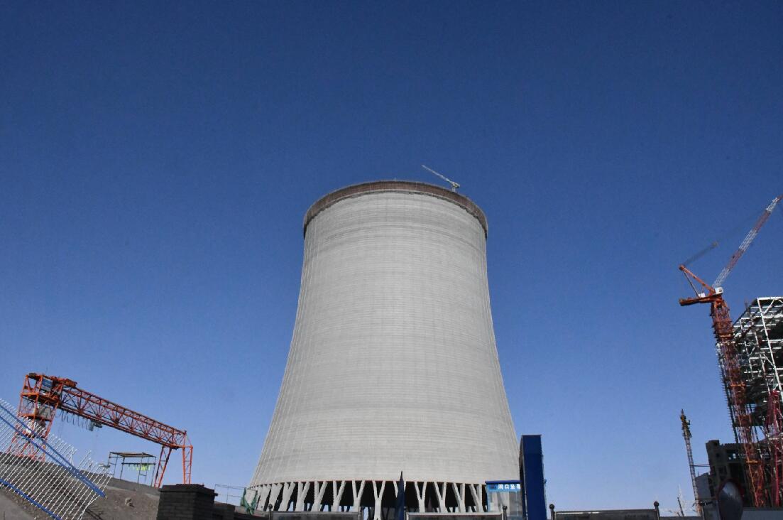 甘肅電投常樂電廠項目超大型自然通風間接空冷冷卻塔設計屬國內一流。四號塔身零米直徑為163米,塔高215米,進風口高度29米,進風口直徑143.8米。由基礎、X柱、環(huán)梁、塔筒等部分組成,于2021年7月上旬開工,X柱采用清水混凝土澆筑,整體澆筑共使用87753立方米混凝土,到頂后的間冷塔筒壁內實外光、曲線流暢、模板接茬平整。塔筒為雙曲線形現(xiàn)澆鋼筋混凝土殼體結構,這種設計有效解決了瓜州縣大風地區(qū)間冷塔設計和運行等技術難題。