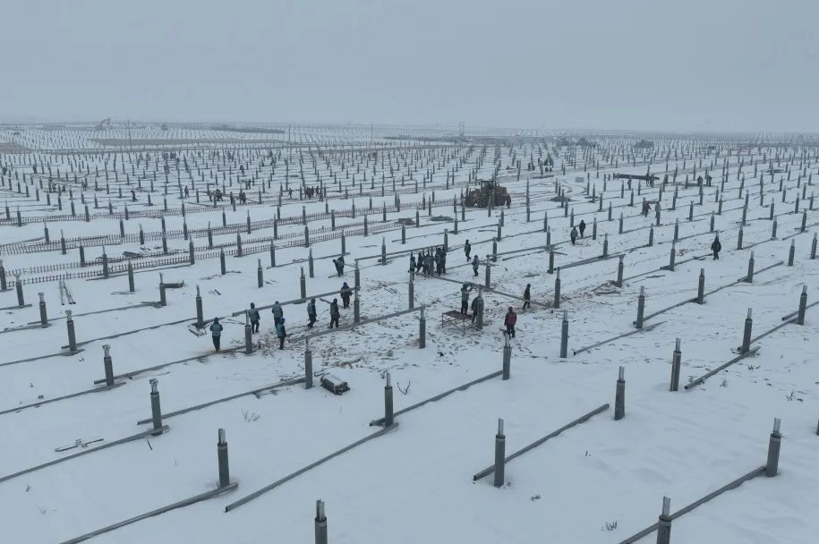 踩著積雪,站在被雪覆蓋的沙丘上,已經(jīng)打好的光伏樁整齊地排列在沙地里,像嚴(yán)陣以待的戰(zhàn)士,只待深藍色的光伏板賦身,便可將沙漠吞噬。