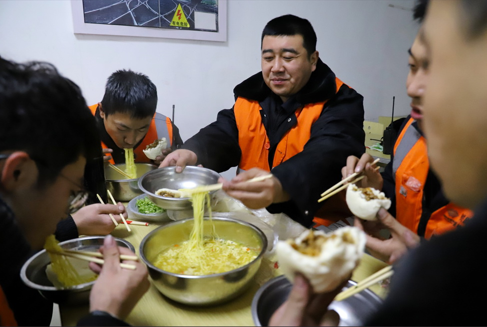 檢車員們列著整齊的隊(duì)伍滿心歡喜地奔向待檢室,圍坐在臨時飯桌旁,他們那一雙雙因長時間戶外作業(yè)而黝黑、僵硬的手,與桌上潔白的筷子形成鮮明對比。餐桌上的面條、饅頭和加熱的菜肴雖簡單,卻在寒夜中散發(fā)著溫暖。
