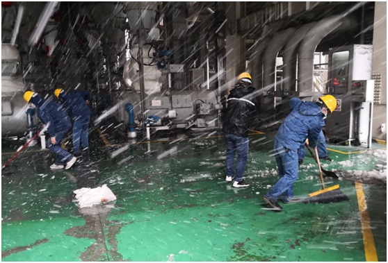 早在幾天前,一收到市氣象局發(fā)布的大雪預(yù)警信息后,楊坤就帶領(lǐng)著六值班組成員進(jìn)行相關(guān)重點(diǎn)區(qū)域的學(xué)習(xí)和操作。工作開始前,楊坤再三叮囑值內(nèi)成員要采取好防護(hù)保暖措施,預(yù)防風(fēng)寒感冒。大雪襲來后,楊坤第一時(shí)間帶領(lǐng)值內(nèi)成員在部門統(tǒng)籌安排下,前往生產(chǎn)現(xiàn)場(chǎng)清雪、撒鹽、鋪設(shè)防滑袋等相關(guān)安全保障措施。風(fēng)雪中,楊坤拿來了幾個(gè)大鐵鍬,在鍋爐12米的給煤機(jī)平臺(tái)上將凍上的冰面一片片敲裂,然后再順著雪一道鏟到通道的兩旁,最后撒上鹽,在相關(guān)區(qū)域鋪上麻袋。有人問他怎么做得這么熟練,他笑著說自己打小在東北的家鄉(xiāng)就干這些事。