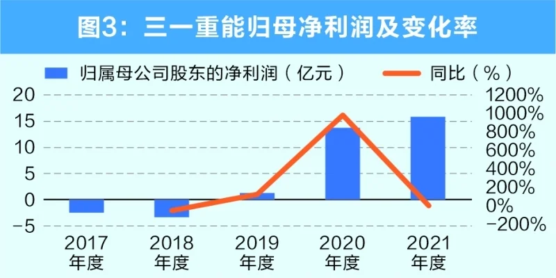 營(yíng)業(yè)收入的高增長(zhǎng)也帶來(lái)了三一重能盈利能力的快速提升。2019年至2021年,公司實(shí)現(xiàn)歸屬于母公司所有者的凈利潤(rùn)1.26億元、13.72億元和15.91億元,增速分別為137.19%、992.53%和16.01%(見(jiàn)圖)。