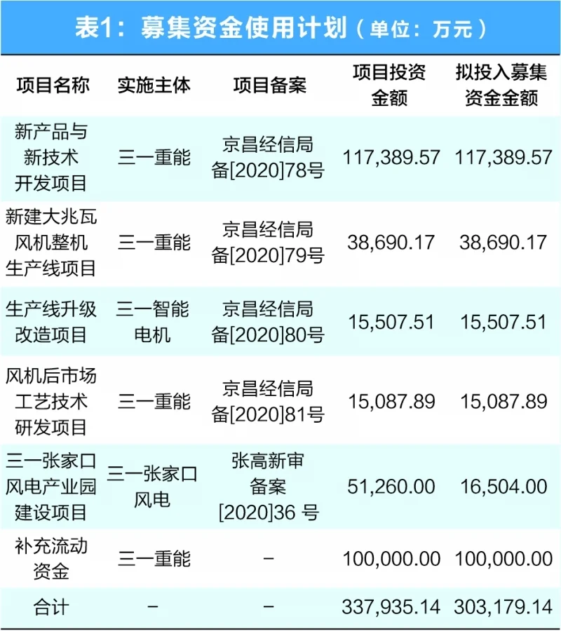 資料顯示,三一重能擬投入30.32億元募集資金用于風(fēng)機(jī)產(chǎn)品相關(guān)技術(shù)的開(kāi)發(fā)。募集資金投資項(xiàng)目主要投資方向圍繞風(fēng)機(jī)產(chǎn)品、核心零部件、后市場(chǎng)服務(wù)等相關(guān)領(lǐng)域開(kāi)展技術(shù)研發(fā)、產(chǎn)線升級(jí)、產(chǎn)能擴(kuò)建,符合重點(diǎn)投向科技創(chuàng)新領(lǐng)域的要求。預(yù)期項(xiàng)目建成后將擴(kuò)大公司在未來(lái)大兆瓦風(fēng)力發(fā)電機(jī)市場(chǎng)上的占有率,從而保持市場(chǎng)競(jìng)爭(zhēng)優(yōu)勢(shì)(見(jiàn)表)。