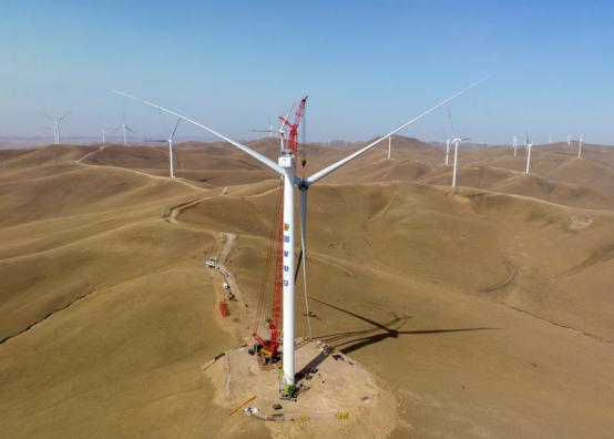 圖為霍林河循環(huán)經(jīng)濟(jì)示范工程火電靈活性改造促進(jìn)市場(chǎng)化消納新能源試點(diǎn)項(xiàng)目30萬千瓦風(fēng)電項(xiàng)目施工現(xiàn)場(chǎng),風(fēng)機(jī)葉輪正在吊裝 圖片來源:國(guó)家電投內(nèi)蒙古公司