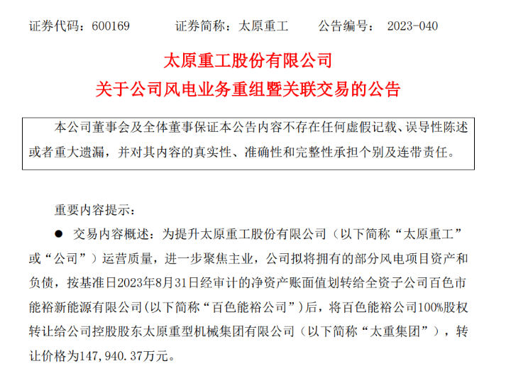 公告披露,太原重工擬將擁有的部分風電項目資產(chǎn)和負債,按基準日2023年8月31日經(jīng)審計的凈資產(chǎn)賬面值劃轉(zhuǎn)給全資子公司百色市能裕新能源有限公司(以下簡稱“百色能裕公司”)后,將百色能裕公司100%股權(quán)轉(zhuǎn)讓給公司控股股東太原重型機械集團有限公司(以下簡稱“太重集團”),轉(zhuǎn)讓價格為147,940.37萬元。