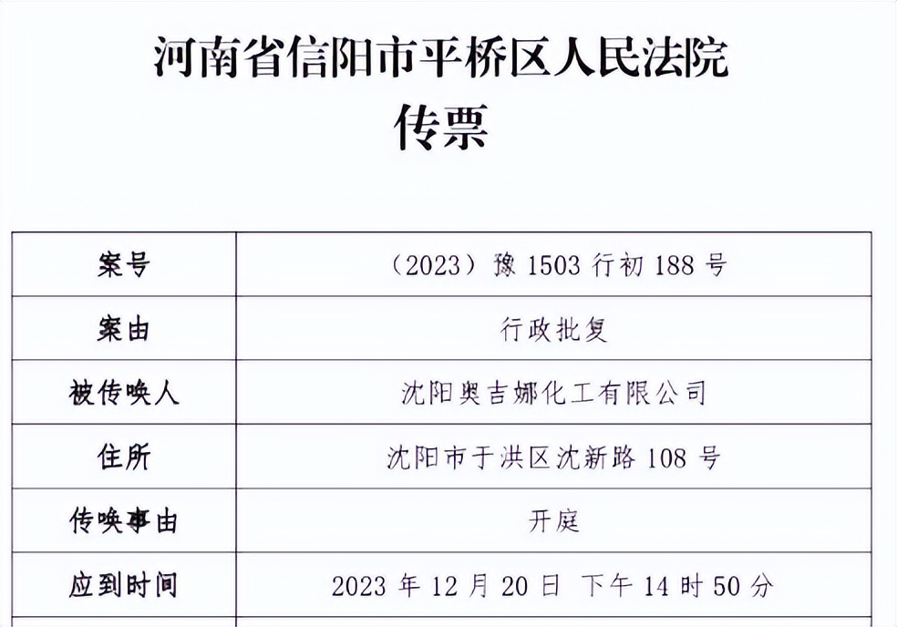 2023年12月1日,中國風電潤滑油龍頭企業(yè)沈陽奧吉娜化工有限公司(下簡稱奧吉娜公司)收到河南省信陽市平橋區(qū)人民法院開庭傳票,奧吉娜公司訴信陽市生態(tài)環(huán)境局和第三人華陽長青投資有限公司行政訴訟案,將于2023年12月20日14時50分開庭審理。屆時,這起風電潤滑油央企招投標“民告官”第一案結果如何,讓我們拭目以待。