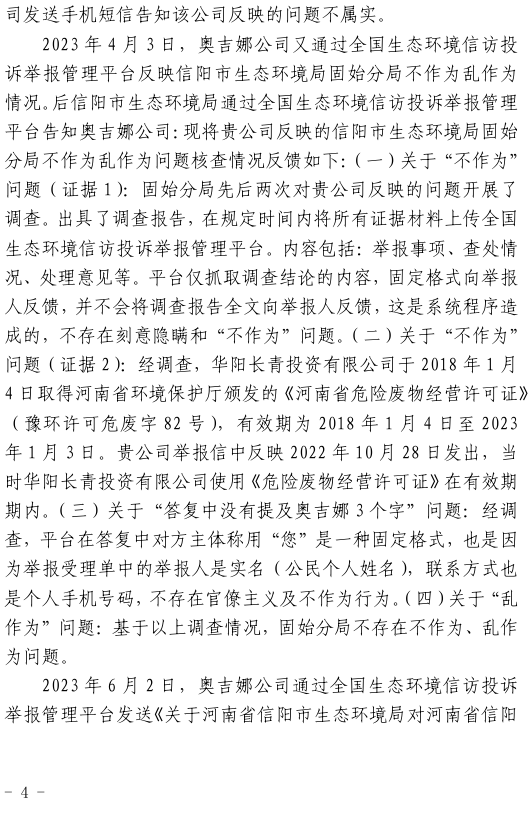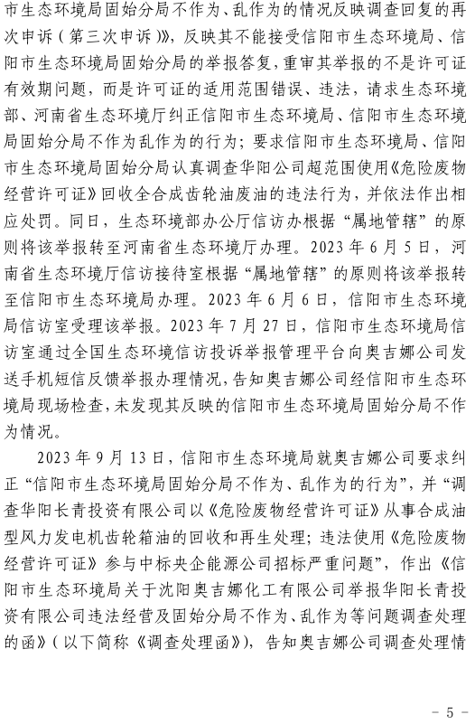 2023年3月9日,奧吉娜公司收到固始分局通過12369環(huán)境信訪平臺的短信答復:“反映問題不屬實”。3月10日,奧吉娜公司向固始分局負責人電話詢問,其解釋稱:經(jīng)調(diào)查核實,華陽長青公司沒有再生風電潤滑油銷售,出售的是新油。否定了奧吉娜公司的舉報內(nèi)容。對此,奧吉娜公司表示強烈不滿。3月11日,奧吉娜公司向環(huán)境部投訴固始分局的不作為和亂作為。2023年5月26日,奧吉娜公司收到12369環(huán)境信訪平臺的短信答復。答復部門為信陽環(huán)境局。令人啼笑皆非的是,答復稱,華陽長青的許可證有效期沒有問題,與舉報內(nèi)容風馬牛不相及。2023年6月13日,奧吉娜公司再次向環(huán)境部提出申訴,指出,奧吉娜舉報的不是許可證有效期問題,而是許可證的適用范圍錯誤、違法。2023年7月27日,奧吉娜公司收到回復稱,經(jīng)信陽市生態(tài)環(huán)境局現(xiàn)場檢查,未發(fā)現(xiàn)固始分局不作為情況。2023年8月3日,奧吉娜公司向河南省生態(tài)環(huán)境廳(以下稱:環(huán)境廳)舉報信陽環(huán)境局包庇固始分局的行為。環(huán)境廳對此高度重視,有關(guān)處長和奧吉娜公司負責人進行了面談。2023年9月13日,信陽環(huán)境局向奧吉娜公司致《信陽市生態(tài)環(huán)境局關(guān)于沈陽奧吉娜化工有限公司舉報華陽長青投資有限公司違法經(jīng)營及固始分局不作為、亂作為等問題調(diào)查處理的函》。函中:一是,以“齒輪箱”替換“齒輪箱油”,偷換概念;二是,做出了廢風電合成(齒輪)油不屬于危險廢物的結(jié)論;三是,未發(fā)現(xiàn)固始分局存在不作為、亂作為的不當行為。再次否定奧吉娜公司的舉報和投訴。