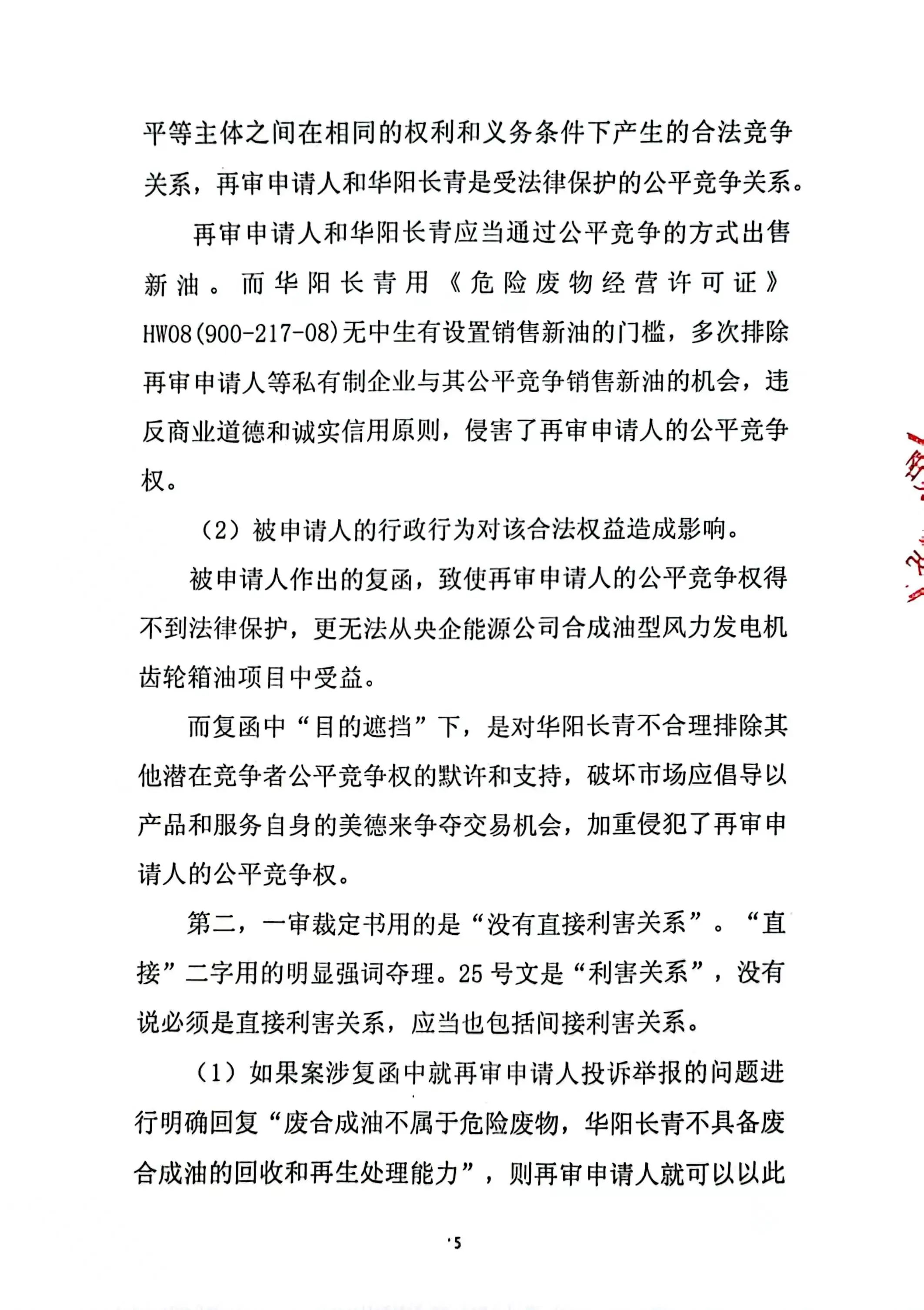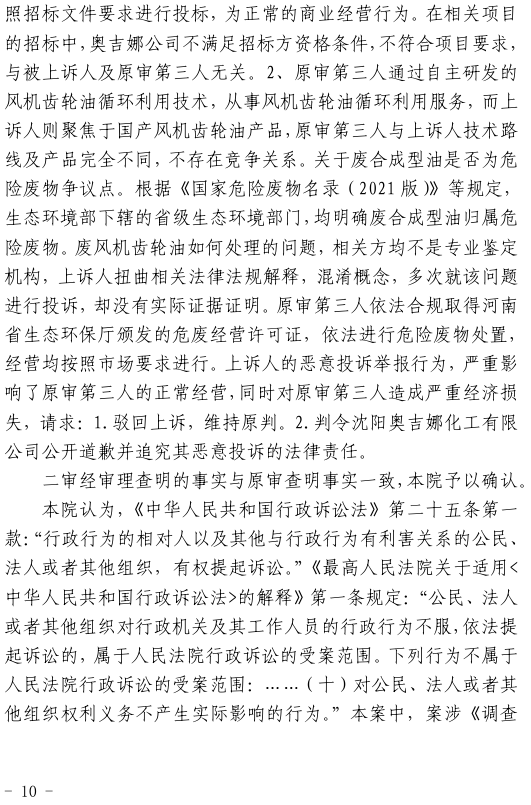 奧吉娜公司在再審申請中再次要求對兩個關(guān)鍵問題進行法庭調(diào)查:1、《調(diào)查處理函》中的回答是錯誤的。信陽市生態(tài)環(huán)境局依據(jù)《國家危險廢物名錄(2021版)》認定廢合成油不屬于危險廢物,不需要《危險廢物許可證》這種回答是錯誤的,而且作為一個市級行政職能部門信陽市生態(tài)環(huán)境局也無權(quán)作出這種認定。2、根據(jù)奧吉娜公司對目前廢合成型風電潤滑油再生技術(shù)的了解,華陽長青公司不具備廢合成型風電潤滑油的再生能力,所謂的再生處理存在造假和欺騙的嫌疑!