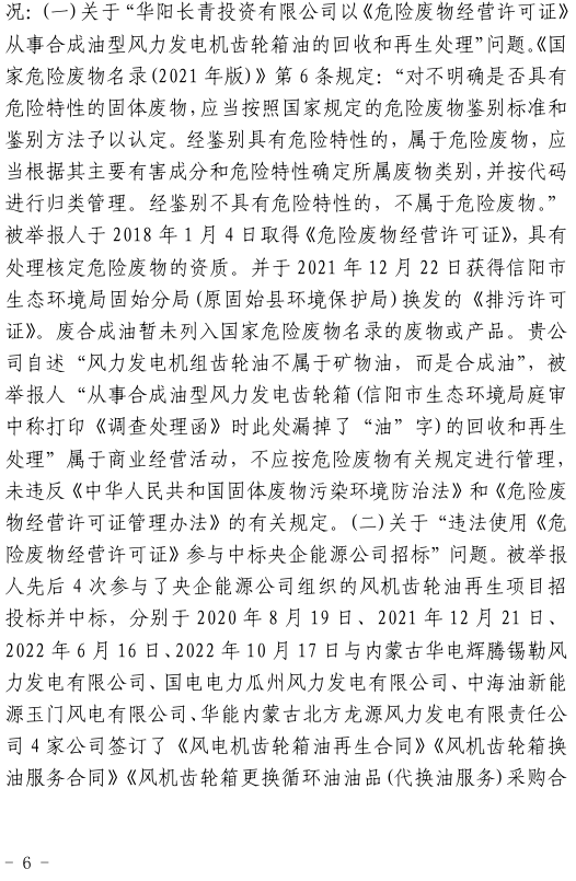 奧吉娜公司在參與各央企風電潤滑油招投標采購中發(fā)現(xiàn),注冊于河南省信陽市固始縣的華陽長青投資有限公司(以下稱:華陽長青公司),憑借其持有的《危險廢物經(jīng)營許可證》,屢次以“風電齒輪油再生利用”的名義中標。然而,奧吉娜公司發(fā)現(xiàn),華陽長青公司的《危險廢物經(jīng)營許可證》適用范圍并不包含合成型廢風電齒輪油,屬于違規(guī)使用,涉嫌違反《環(huán)境保護法》。于是,2022年10月18日,奧吉娜公司依法向國家生態(tài)環(huán)境部(以下稱:環(huán)境部)進行舉報。按程序,舉報調(diào)查由信陽市生態(tài)環(huán)境局固始分局(以下稱:固始分局)辦理。
