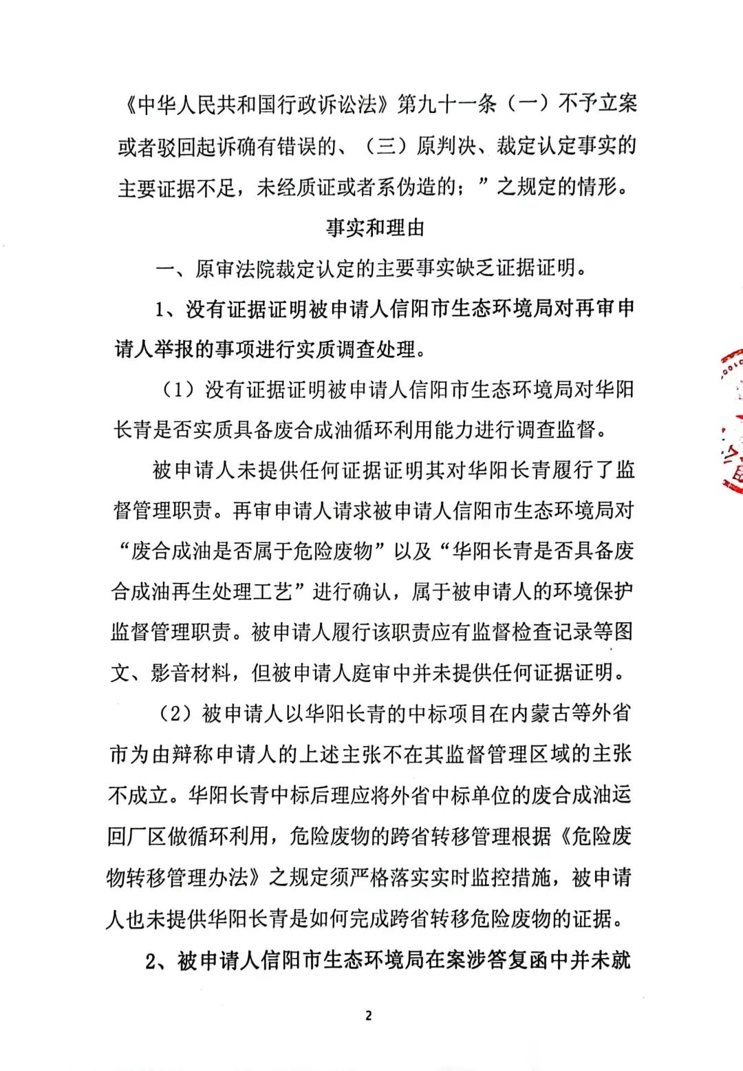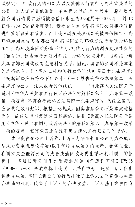 2、一審訴訟請求:請求人民法院判決撤銷被告作出的《信陽市生態(tài)環(huán)境局關(guān)于沈陽奧吉娜化工有限公司舉報華陽長青投資有限公司違法經(jīng)營及固始分局不作為、亂作為等問題調(diào)查處理的函》;責令被告對原告向被告舉報華陽長青投資有限公司事項,限期進行重新調(diào)查和答復;判令被告認定的廢合成油不應按危險廢物有關(guān)規(guī)定進行管理違反法律規(guī)章規(guī)定,無效。