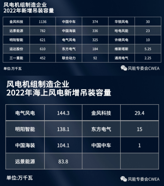 2022年,中國新增吊裝容量前五的風電機組制造企業(yè)是金風科技、遠景能源、明陽智能、運達股份、三一重能,其新增裝機容量分別為1136萬千瓦、782萬千瓦、621萬千瓦、610萬千瓦、452萬千瓦。