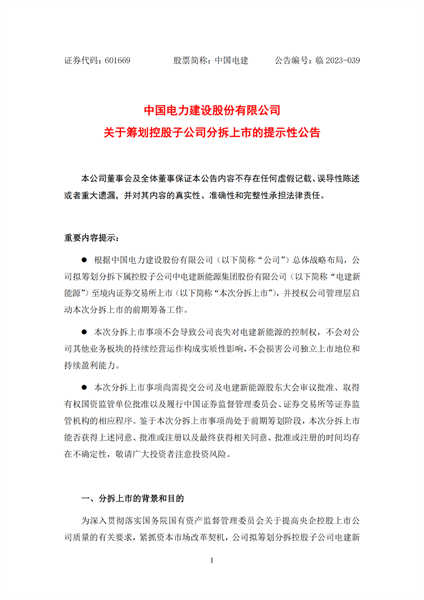 根據(jù)公告,擬拆分的中電建新能源集團(tuán)股份有限公司注冊(cè)資本為60億元,經(jīng)營(yíng)范圍包括水電發(fā)電、風(fēng)力發(fā)電、太陽能發(fā)電、生物發(fā)電再生能源開發(fā)等。目前,電建新能源正在推進(jìn)引入戰(zhàn)略投資者相關(guān)工作。