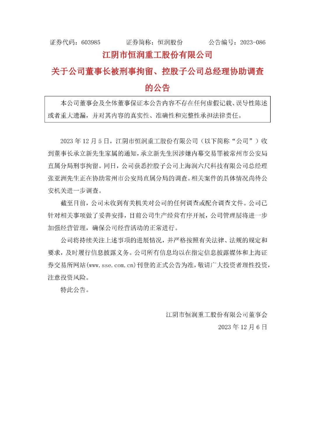 公告顯示, 2023 年 12 月 5 日,江陰市恒潤重工股份有限公司(以下簡稱“公司”)收到董事長承立新先生家屬的通知,承立新先生因涉嫌內(nèi)幕交易罪被常州市公安局直屬分局刑事留。同日,公司獲悉控股子公司上海潤六尺科技有限公司總經(jīng)理張亞洲先生正在協(xié)助常州市公安局直屬分局的調(diào)查。相關(guān)案件的具體情況尚待公安機(jī)關(guān)進(jìn)一步調(diào)查。