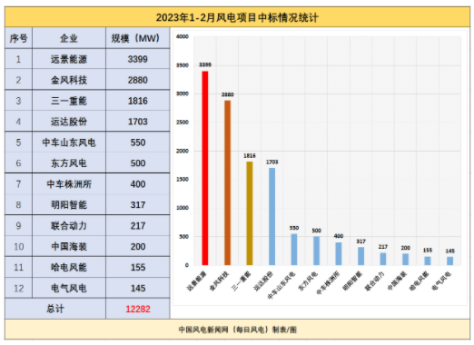 據(jù)每日風(fēng)電統(tǒng)計,2023年1-2月,59個風(fēng)電項(xiàng)目的中標(biāo)情況顯示,已開標(biāo)項(xiàng)目總規(guī)模達(dá)12282MW,涉及12家整機(jī)商。