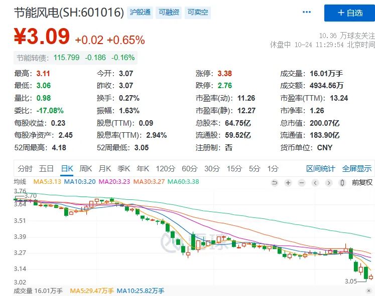 二級市場上,截至24日午間收盤,節(jié)能風電上漲0.65%,報3.09元/股。