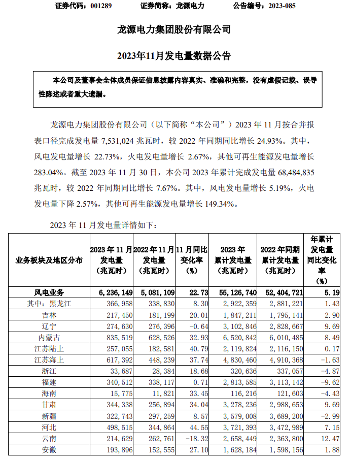 12月8日,龍?jiān)措娏Πl(fā)布2023年11月發(fā)電量數(shù)據(jù)公告。