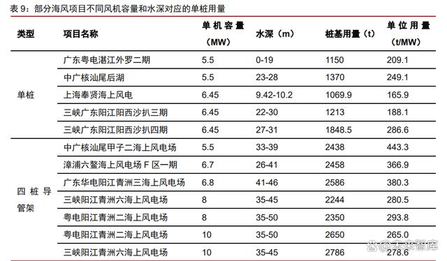 風電大型化和深?;苿訕痘⑺矄螜C用量增長。據(jù)海力風電招股書,適用于 0- 24m 水深單機容量 4MW 的單樁基礎(chǔ)重量在每臺 550-1000 噸之間;水深 30m 以上單機 容量 5MW 使用的四樁導(dǎo)管架基礎(chǔ)重量為 243 噸。以三峽陽江沙扒三期和三峽陽江青洲六 項目對比測算樁基塔筒單機用量,陽江沙扒三期安裝單機容量 6.45MW 風機 62 臺,陽江 青洲六分別安裝 8MW 和 10MW 容量風機 25 和 80 臺,風機葉片直徑、輪轂高度數(shù)值均增 大,單臺塔筒和樁基用量為 734 噸和 2657 噸,較淺水域小容量風機項目對應(yīng)的 380 噸和 1693 噸用量提升。