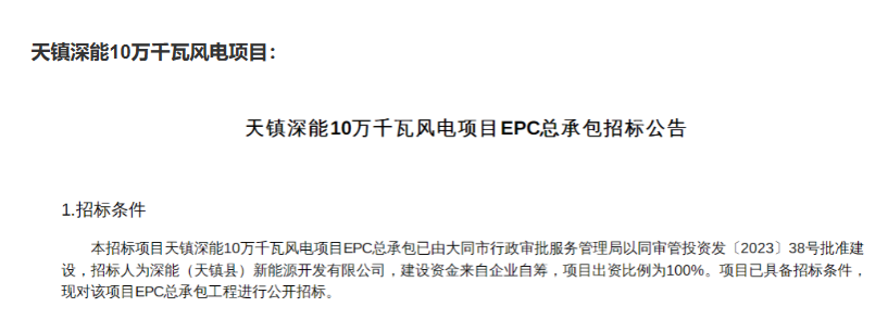 公告顯示,天鎮(zhèn)深能10萬千瓦風(fēng)電項(xiàng)目總裝機(jī)容量為100MW,主要建設(shè)內(nèi)容為新建220KV升壓站一座,同步配3.3MW/3.3MWh儲(chǔ)能系統(tǒng),安裝18臺(tái)風(fēng)力發(fā)電機(jī)組、35kV集電線路配套附屬設(shè)施等,項(xiàng)目總投資約51557萬元。