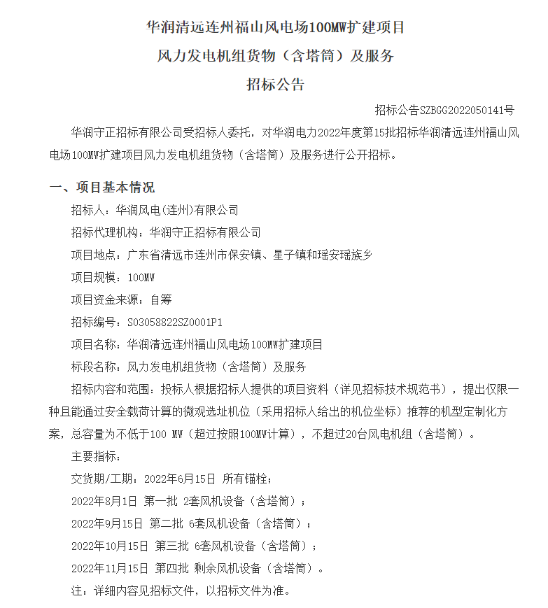 華潤清遠連州福山風電場100MW擴建項目風力發(fā)電機組貨物(含塔筒)招標