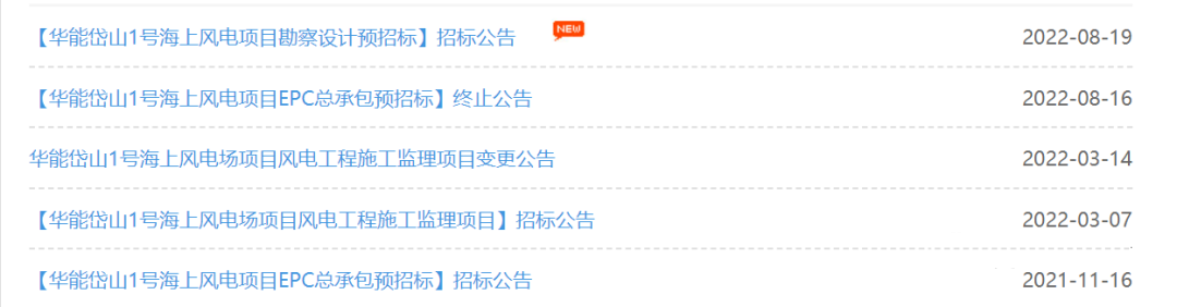 從華能電子商務(wù)平臺獲悉,《華能岱山1號海上風電項目EPC總承包預招標項目》于2021年11月16日發(fā)布招標公告。截止8月16日發(fā)布終止公告之日,已耗時近一年之久。